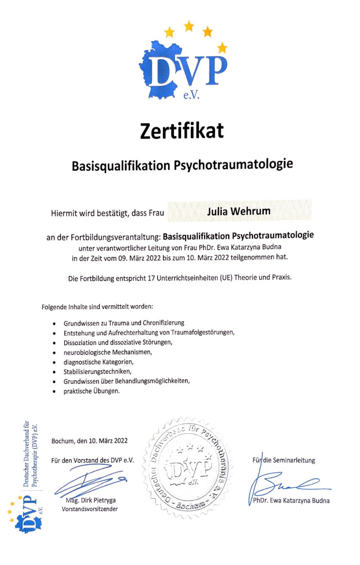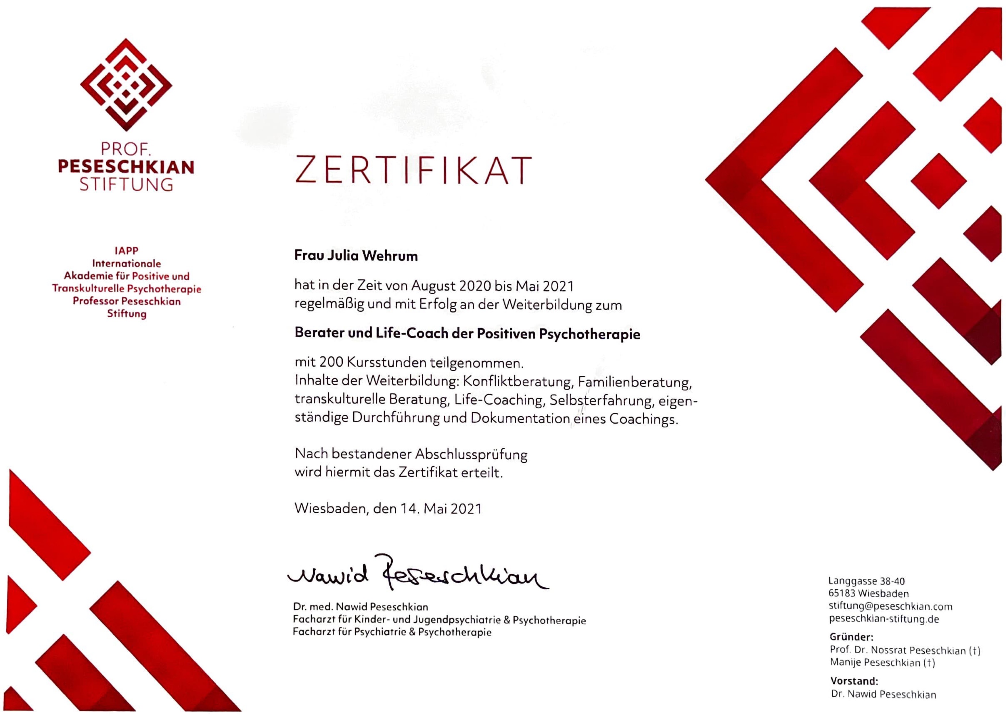Aus diesem Grund habe ich im Jahr 2020 meine Ausbildung zur Beraterin in der Positiven Psychotherapie nach Prof. Dr. Nossrat Peseschkian begonnen und erfolgreich im Jahr 2021 absolviert.